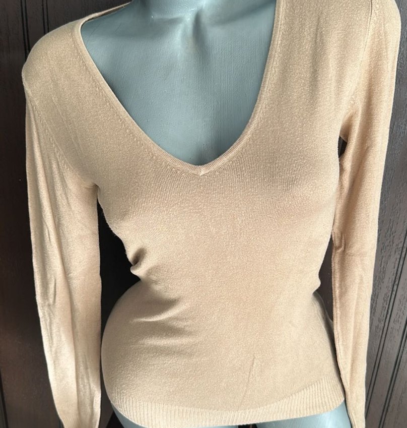 Bej renkli, V yakalı ve uzun kollu kadın triko. İnce ve ipeksi kumaştan, rahat ve şık bir görünüm sunar.