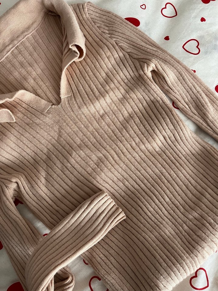 Bej renkli, V yakalı ve uzun kollu, normal boyda triko kazak. Yumuşak dokusu ve sade tasarımlı.toz pembe renginde kullanışlı isteğe bağlı uzun veya kısa kullanılabilir crop değildir ama crop gibi de kullanılabilir ayarlanabilirsiniz