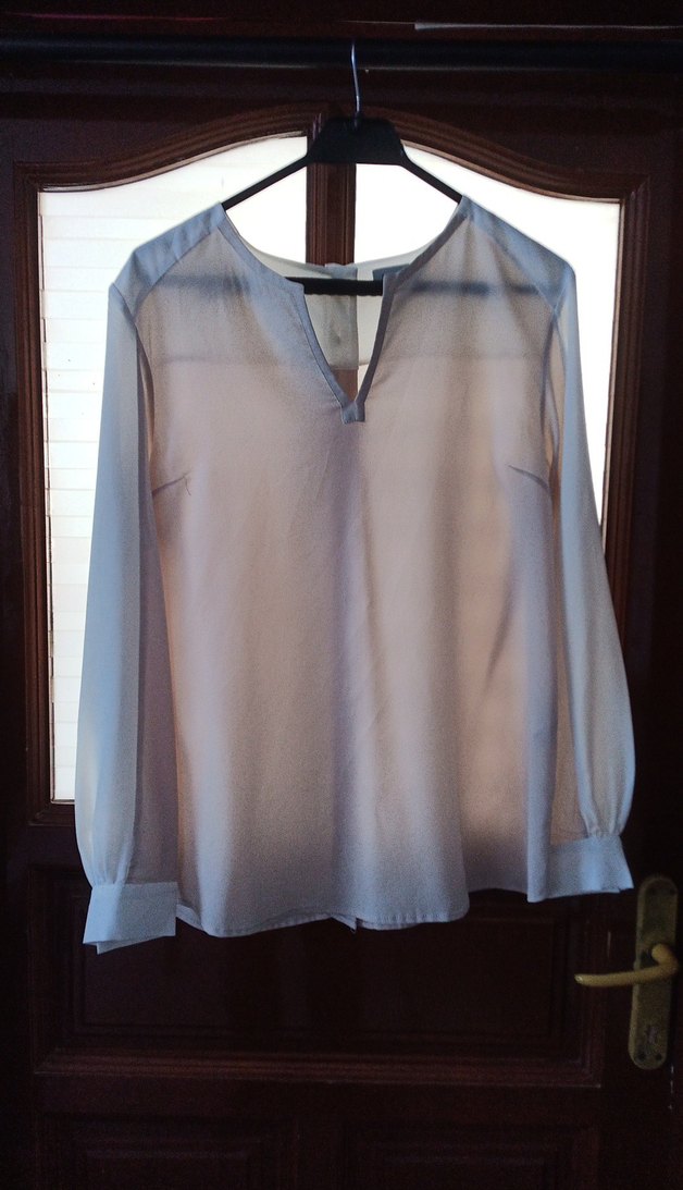 Bej renkli, V yakalı, uzun kollu kadın gömleği, sentetik kumaştan yapılmıştır. Rahat kesimi ve midi boyu ile minimal günlük stil için uygundur.