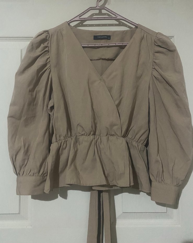 Bej rengi bluz, V yakalı, uzun balon kol ve kemerli. Midi boyu ve bol kesimiyle günlük rahat Paris tarzı sunar.