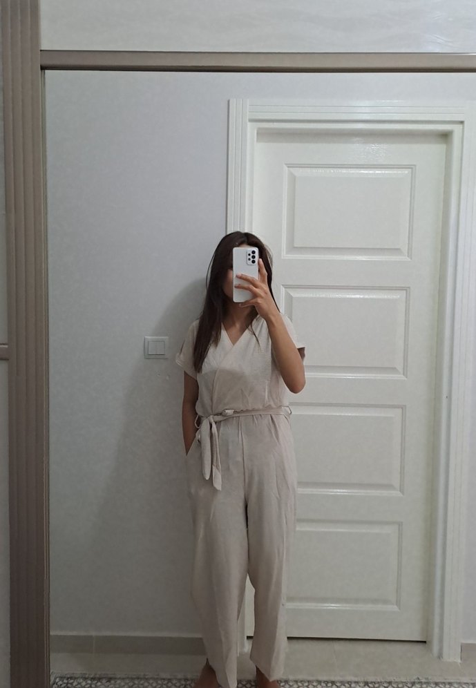 Bej keten kumaştan, V yakalı ve kısa kollu, rahat kesimli midi tulum. Minimalist ve şık, günlük kullanıma uygun.