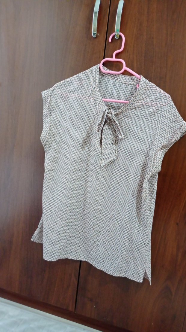 Bej renk, V yakalı ve kısa kollu bluz. Rahat kesimi ve midi boyu ile günlük sokak stiline uygun, yumuşak sentetik kumaştan üretilmiştir.