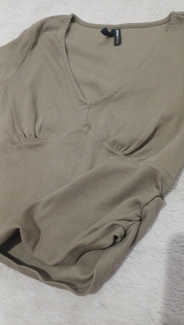 Bej renkli, V yakalı ve kısa kollu, yumuşak keten kumaştan yapılmış, vücuda oturan hamile bluzu. Günlük rahat kullanım için sade ve desensiz tasarım. ✨