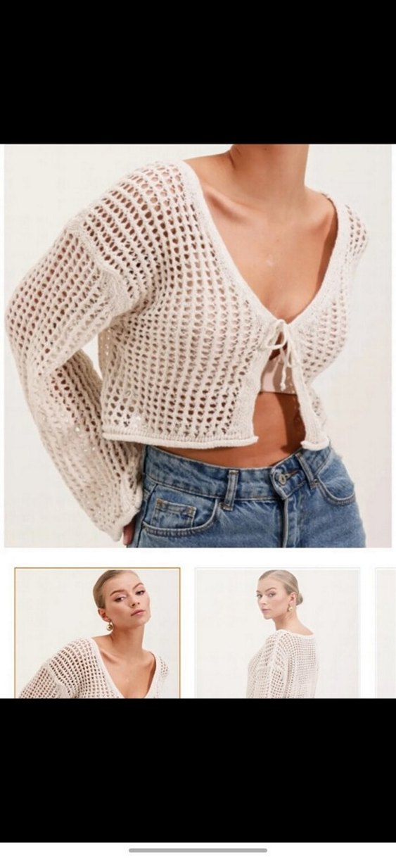 Açık bej renkli, V yakalı ve uzun kollu örgü kadın kazak. Salaş kesimi ve kısa boyu ile günlük sokak stiline uygundur.