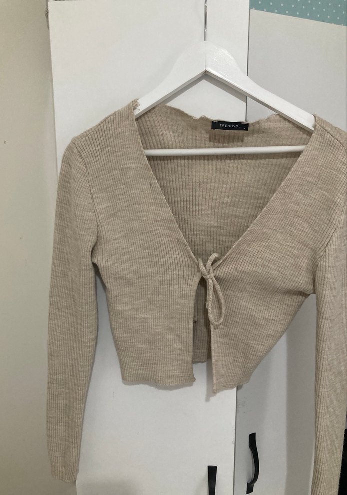 Bej renkte, ince triko dokulu, kısa ve v yaka tasarımlı hırka. Uzun kollu ve önden bağlamalı, rahat ve şık günlük kullanım için uygundur.