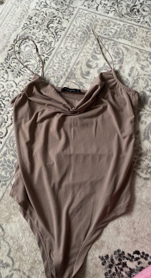 Bej renkli, kolsuz ve V yakalı hemşirelik bodysuit. Sade ve düz yapıda, normal midi boyunda ve vücuda oturan kesime sahip.