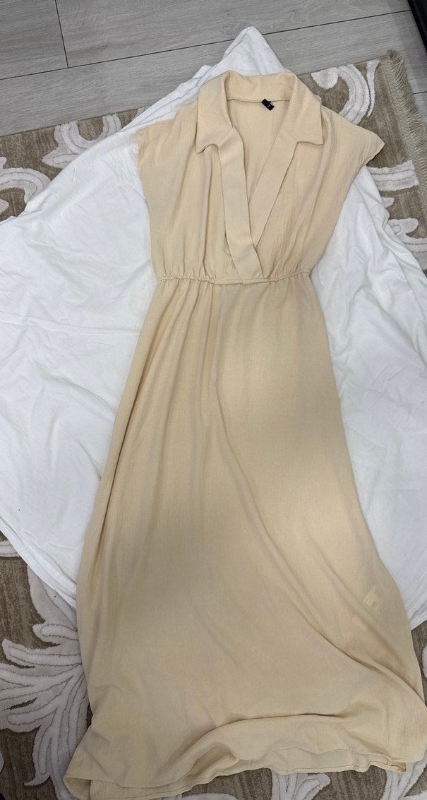 Bej renk, V yakalı ve drapeli kolsuz uzun elbise. Yumuşak sentetik kumaştan, vücuda oturan kesimiyle ofis kullanımı için uygun.