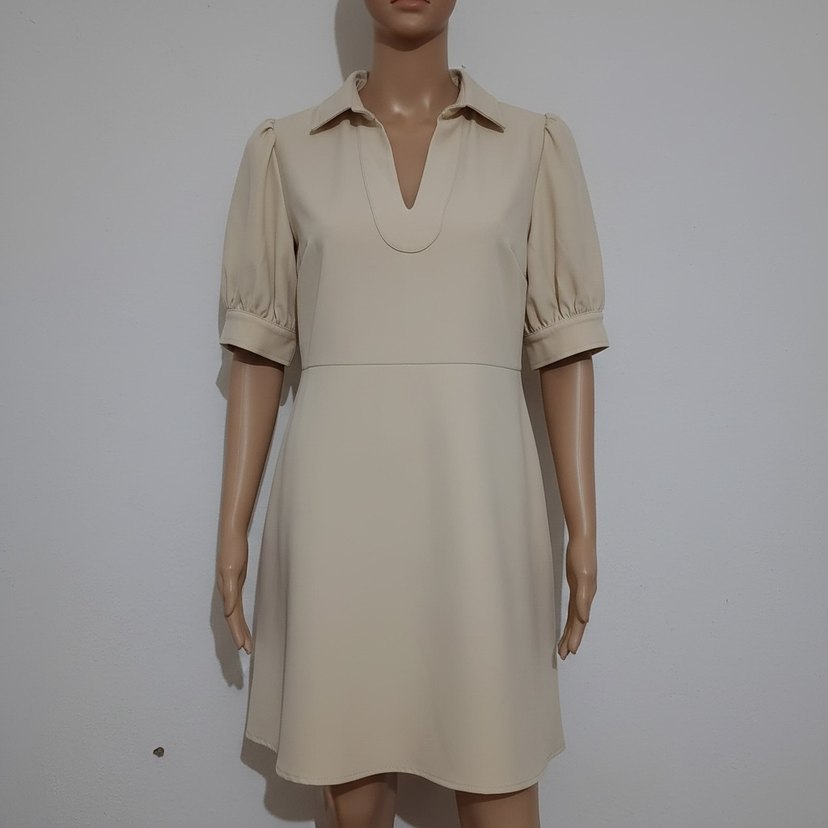 Bej renkli, V yakalı midi elbise, kısa balon kollu ve rahat kesimlidir. Sentetik kumaştan yapılmış, ofis için uygun şık ve çağdaş bir modeldir.