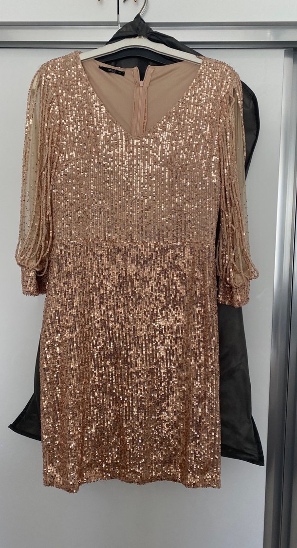 Bej renkli, payetli ve desenli midi uzunlukta gece elbisesi. V yakalı, uzun kollu ve bol kesimli, drapeli tasarıma sahiptir. ✨