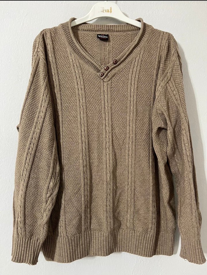 Bej renkli, düğmeli V yakalı, uzun kollu, bol kesim örgü kazak. Rahat dokusu ile günlük kullanıma uygun.