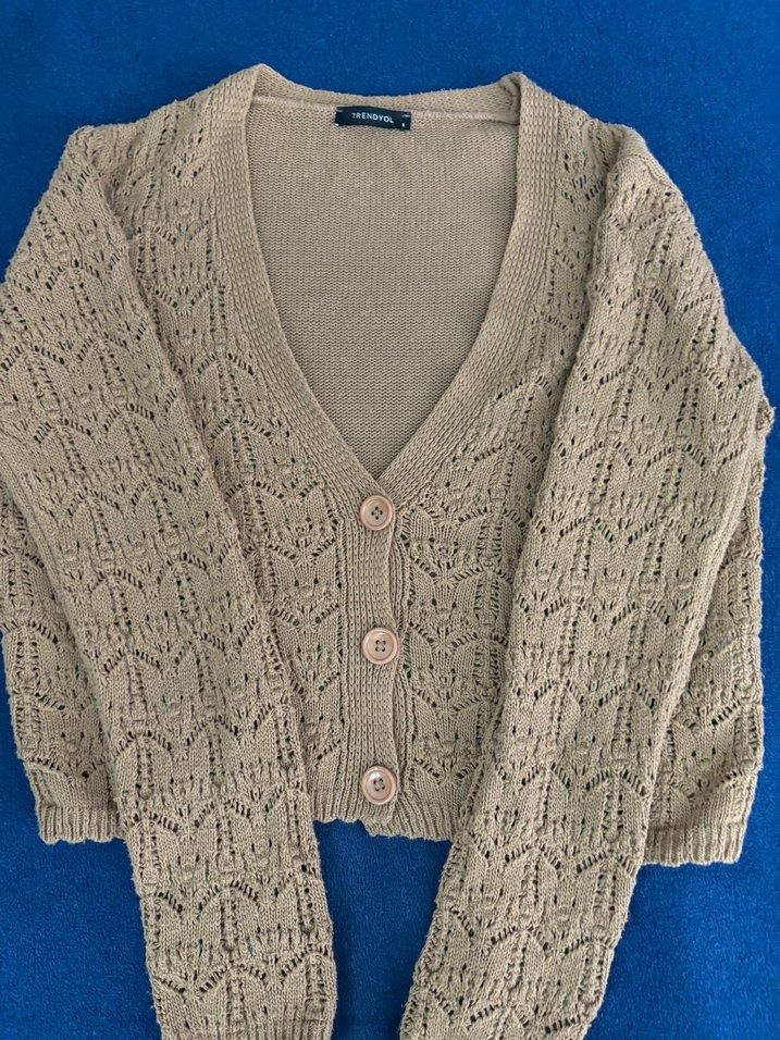 Bej renkte, V yakalı ve uzun kollu örgü kadın hırka. Salaş kesimi ve midi boyu ile rahat ve trend bir günlük stil sunar.