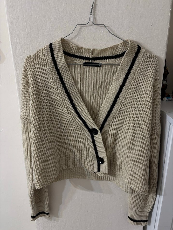 Bej V Yakalı Örgü Kadın Hırka - Görsel 1