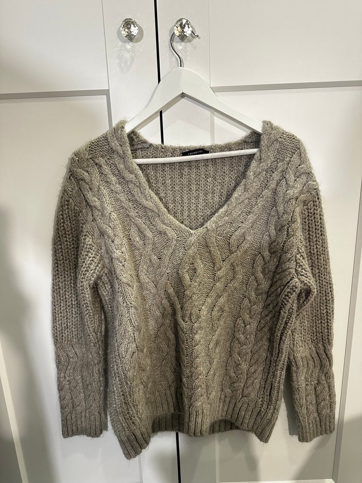 Bej renkli, V yakalı, uzun kollu ve bol kesim örgü kazak. Rahat ve sade tasarımıyla günlük kullanıma uygundur.