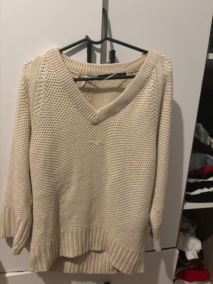 Bej renkli, V yakalı ve uzun kollu örgü kazak. Rahat, bol kesim ve normal midi boyu ile günlük kullanıma uygundur.