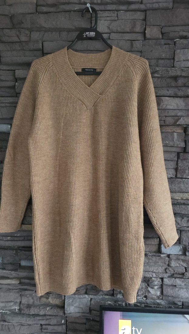 Bej V Yakalı Örgü Kazak