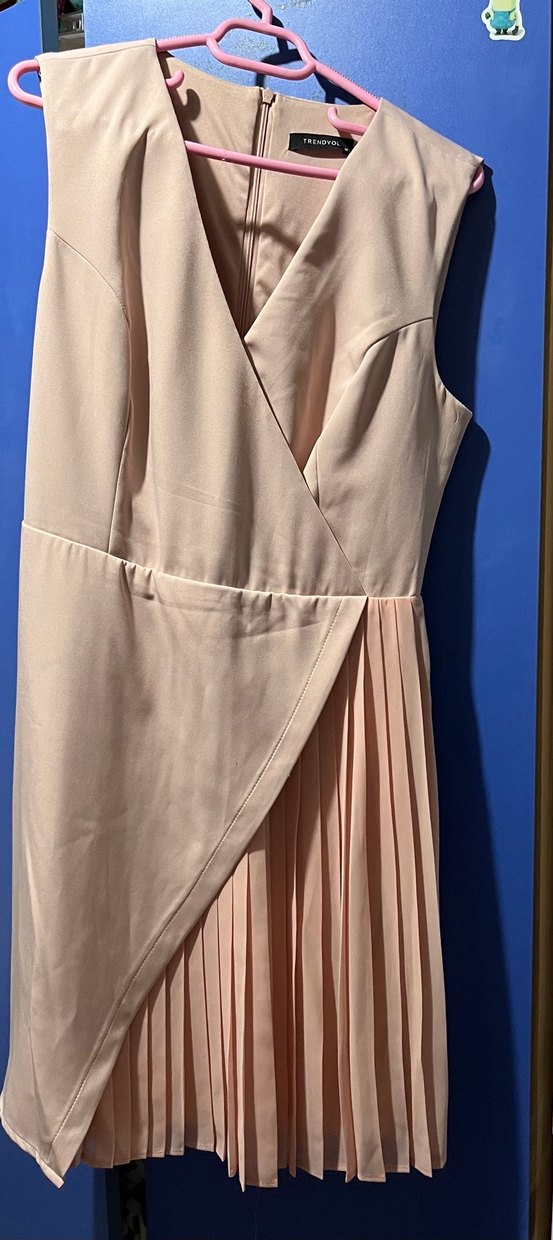 Bej renkli, V yakalı ve kolsuz uzun abiye elbise, pilili etek detayıyla düzenli kesime sahiptir. Düğünler için modern ve desensiz bir tasarımdır.