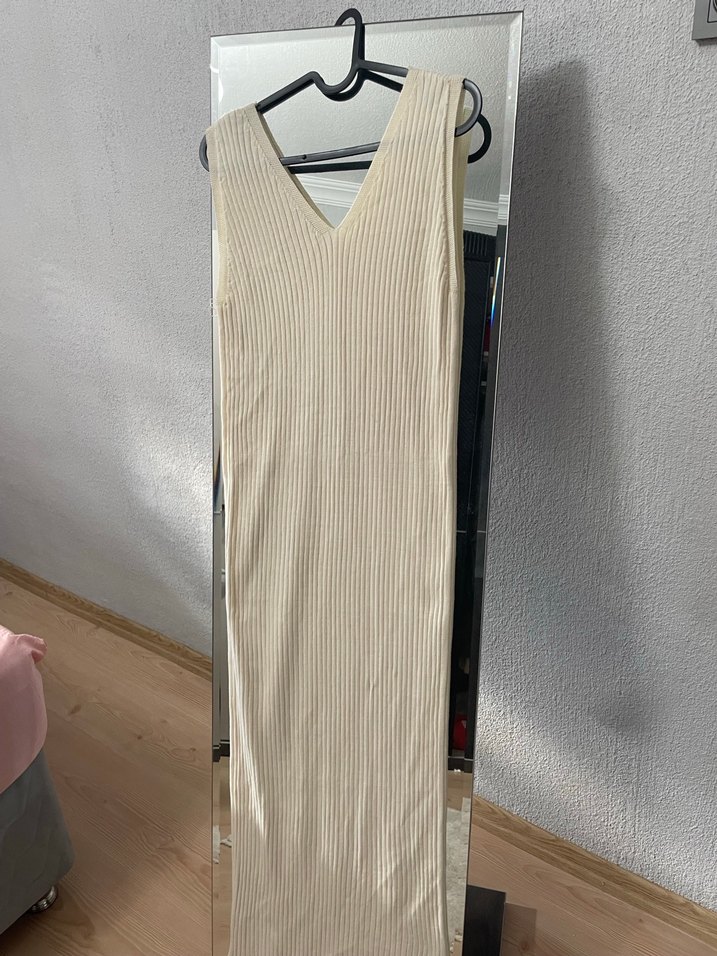Bej renkte, V yakalı ve piliseli detaylara sahip, uzun ve kolsuz elbise. Hafif sentetik kumaştan günlük kullanım için uygundur. M beden ancak hafif dar kalıp.