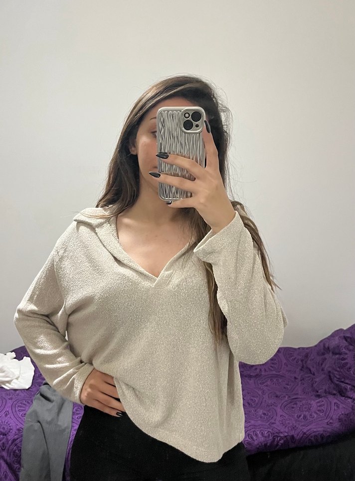 V yakalı, uzun kollu, bej renk salaş kadın kazak. Yumuşak sentetik kumaştan üretilmiş, günlük rahat kullanıma uygun, sokak stiline uyumlu.