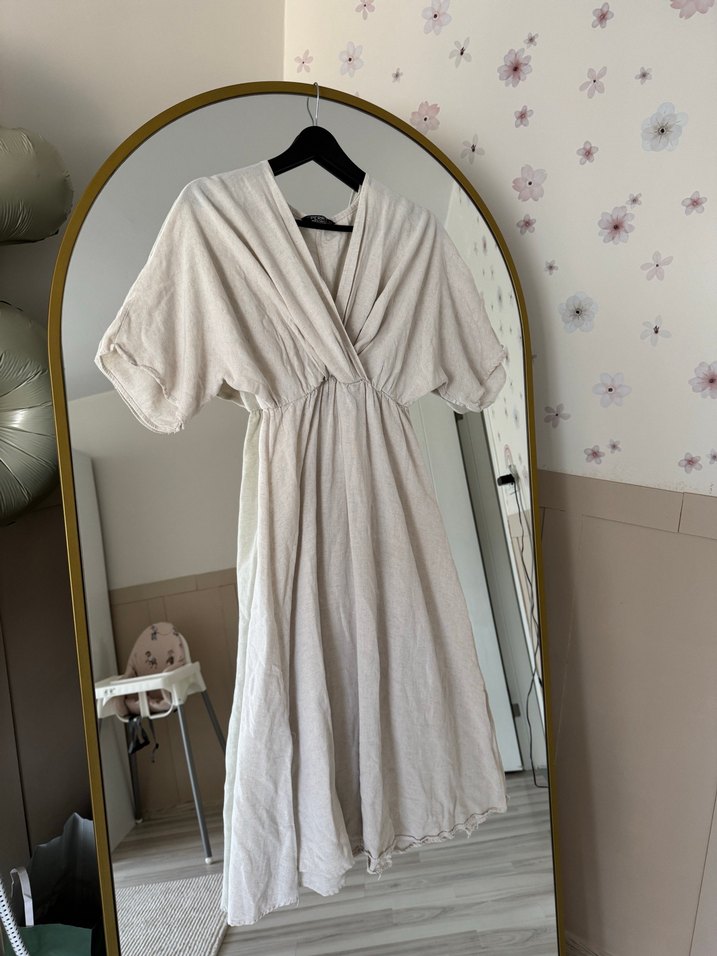 Bej V Yakalı Salaş Keten Uzun Elbise
