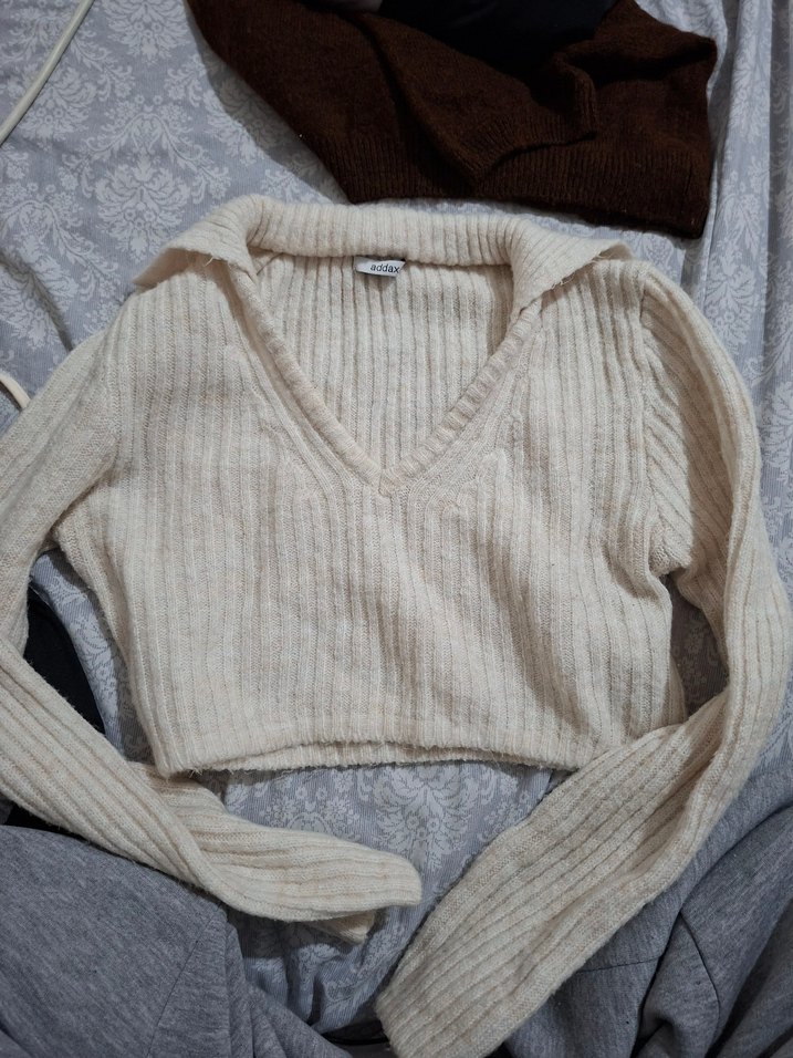 Bej renkli, uzun kollu ve v yaka triko kadın kazak. İnce ve vücuda oturan kesimiyle midi boyda, desen içermeyen rahat bir modeldir.