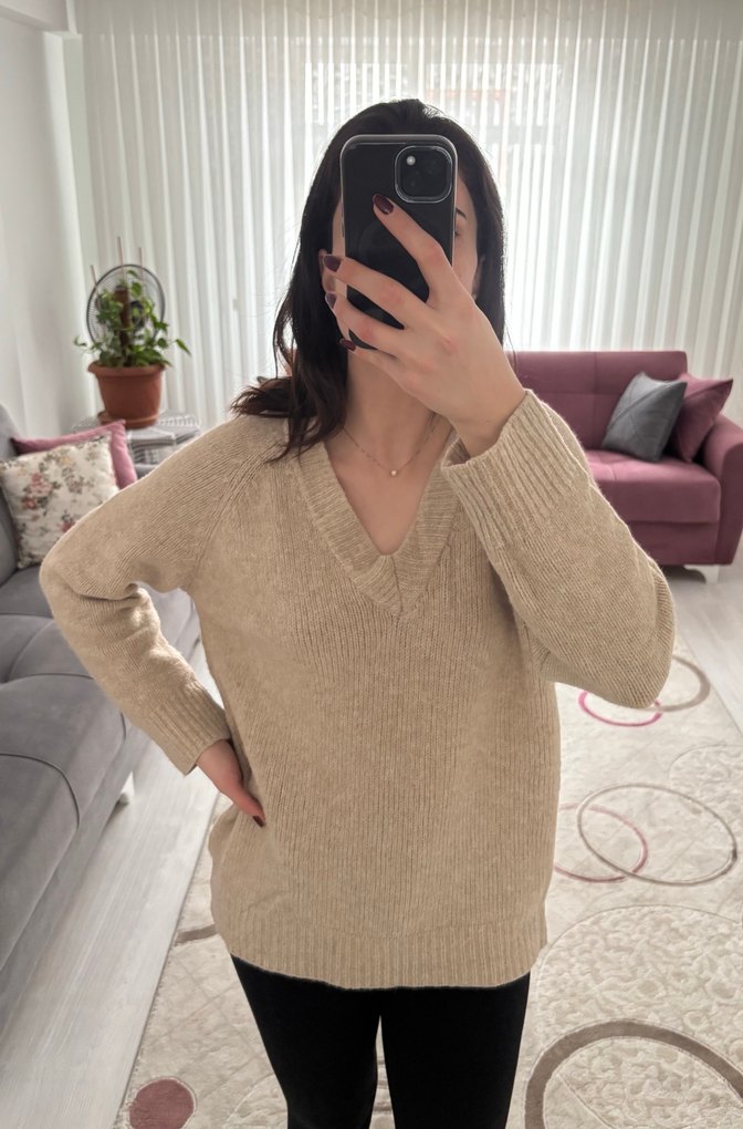 Bej renkli, V yakalı, bol kesim ve uzun kollu triko kazak. Normal midi boyda ve desensiz, rahat ve trend bir günlük tercih. Bershka S beden hiç giyilmedi.
