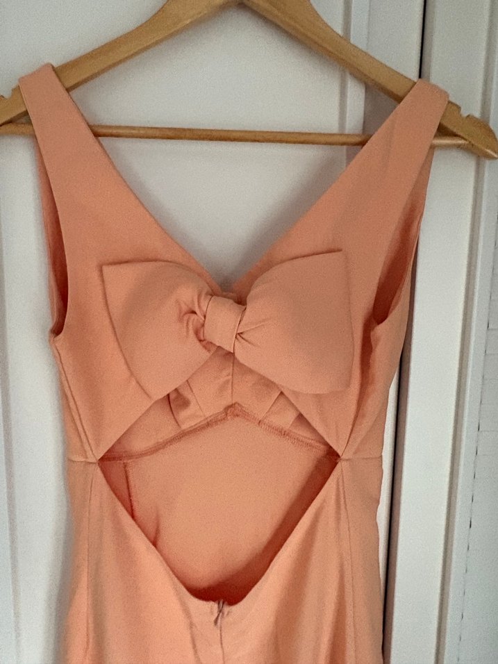 V yakalı, askılı ve beli büyük fiyonk detaylı, uzun kesim bej abiye elbise. Romantik akşamlar için modern ve sade tasarım.