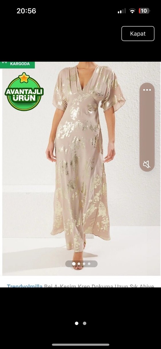 Bej renkli, V yakalı, dökümlü ve bol kesim uzun elbise. Kısa kollu, ipeksi kumaştan, hafif desenli ve düğün için uygun.