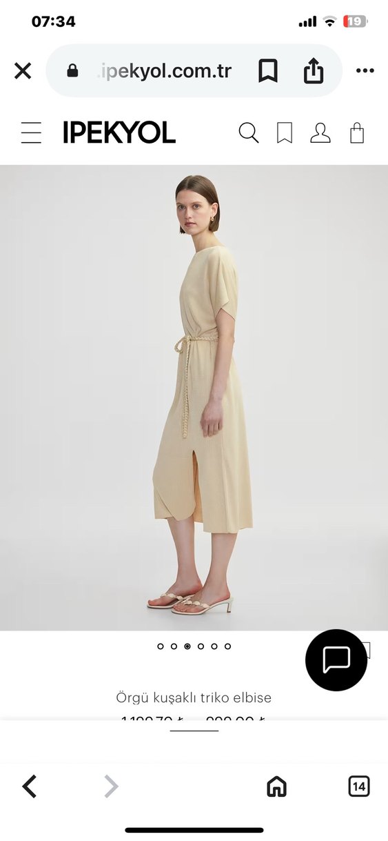 Bej renkli, V yakalı ve kısa kollu uzun elbise. İnce, ipeksi kumaştan, belde bağlama ipi ve yan yırtmaçlarla rahat ve şık bir görünüm sunar. Renk resimde göründüğü gibi