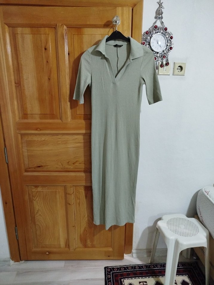 Bej renkte, V yakalı ve kısa kollu uzun elbise. M beden yumuşacık kumaşlı elbise, mint yeşili