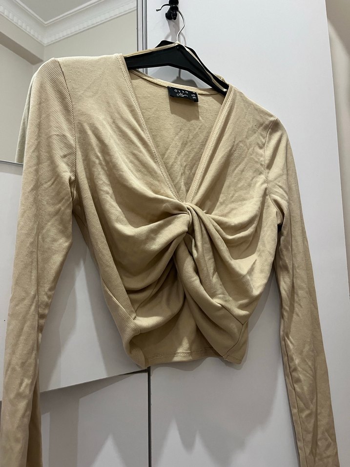 Bej V Yakalı Uzun Kollu Drapeli Kadın Bluz