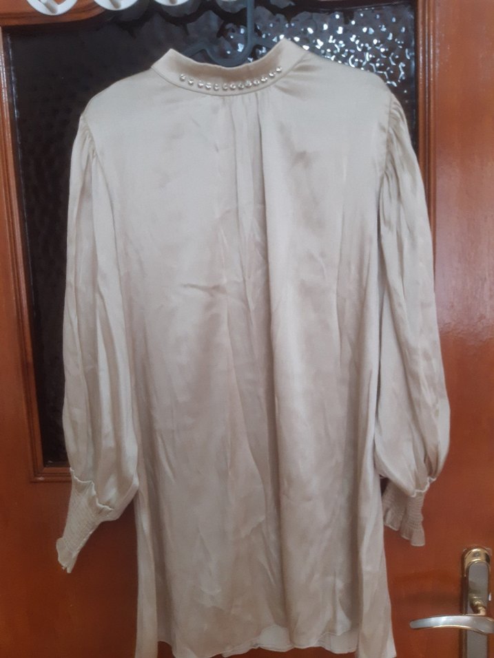Bej renkte, parlak ve ipeksi kumaştan, drapeli uzun kollu, V yakalı, bol kesim vintage bohem tarzında kadın bluz. Ofis kullanımı için uygundur. ✨