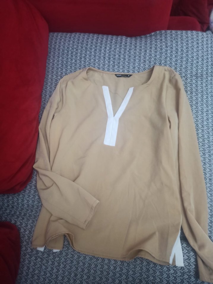Bej renkli, V yakalı ve bol kesim uzun kollu kadın gömleği. Yumuşak sentetik kumaştan, rahat sokak stili için uygun.