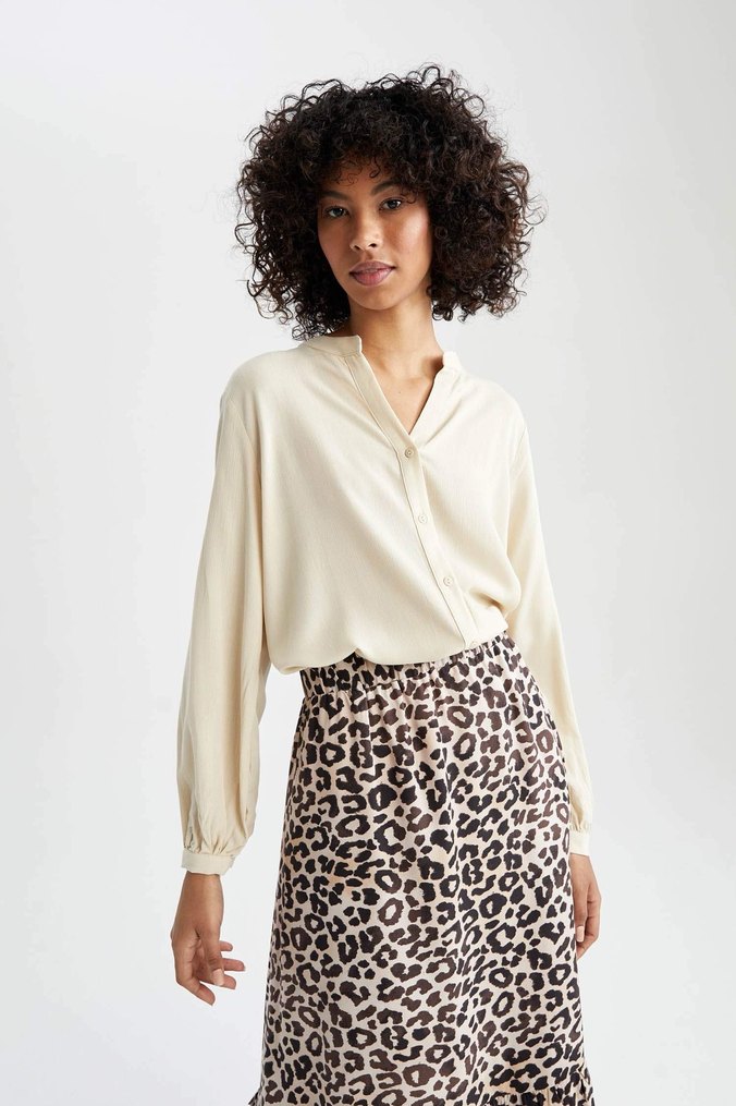 Bej V Yakalı Uzun Kollu Kadın gömlek