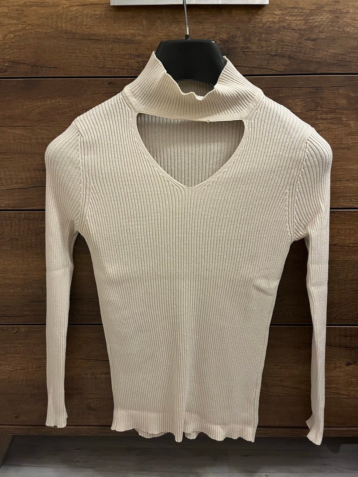 Bej renk, uzun kollu, V yakalı ve örgü dokulu, ince kesim kadın kazak. Rahat sokak stiline uygun, günlük kullanıma ideal.