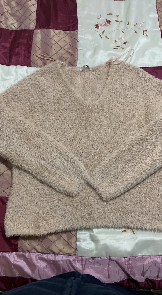Bej renkte, V yaka ve uzun kollu, gevşek kesimli yumuşak dokulu triko kazak. Pastel tonu günlük kullanıma uygundur. Simli