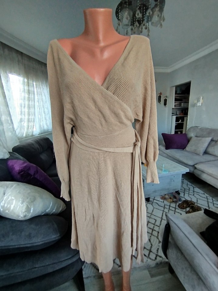 Bej renkli, v yakalı ve askılı uzun kollu, bol kesim, drapeli örme elbise. Günlük kullanıma uygun, bohem tarzda rahat bir model.