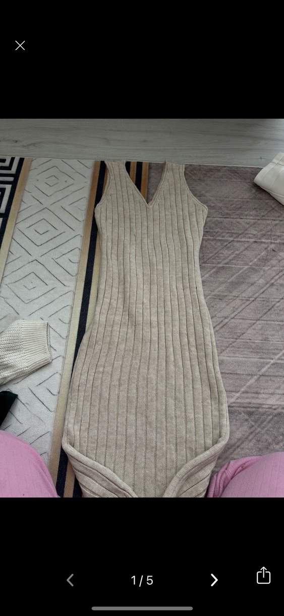 Kolsuz, v yakalı ve uzun kesim triko elbise. Bej rengi ve fit kesimiyle gündelik kullanıma uygun, rahat bir sokak stili sunar.