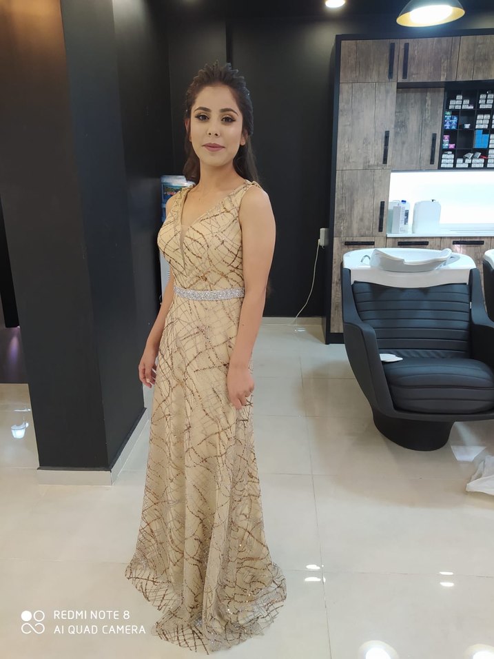 Bej renkli, V yakalı, kolsuz ve yılan desenli uzun abiye elbise. Drapeli ve rahat kesimiyle düğünler için uygun klasik şıklık sunar.