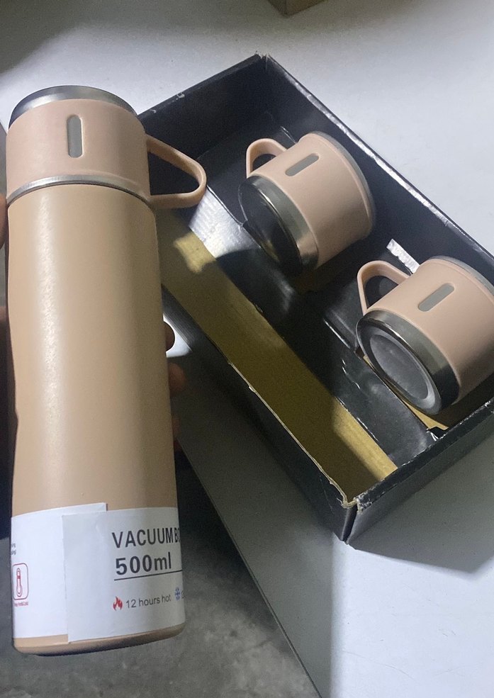 Bej vakumlu termos seti, üç bardak ve termos içerir. İçecekleri sıcak tutmak için tasarlanmıştır ve 'VACUUM FLASK SET' yazılı siyah taşıma çantasıyla gelir. ☕