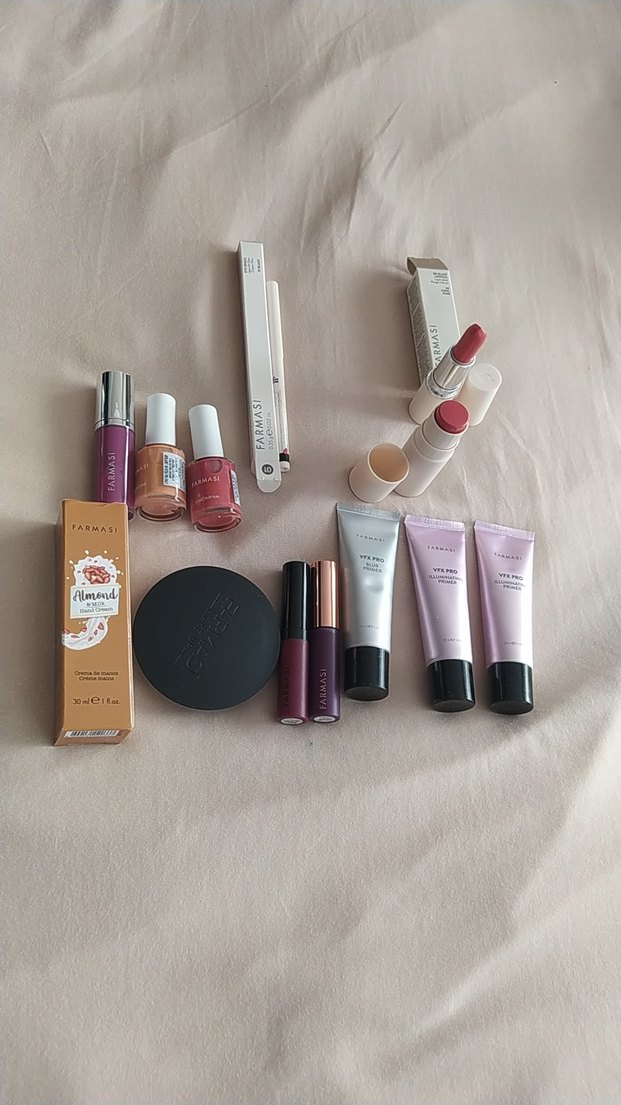 Farmasi markalı açık bej ve canlı tonlarda, ruj, oje, fondöten ve krem içeren makyaj ürünleri seti.