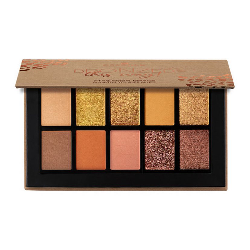 Mat ve ışıltılı bej, altın ve sıcak tonlardan oluşan göz farı paleti, çeşitli makyajlar için uygundur.