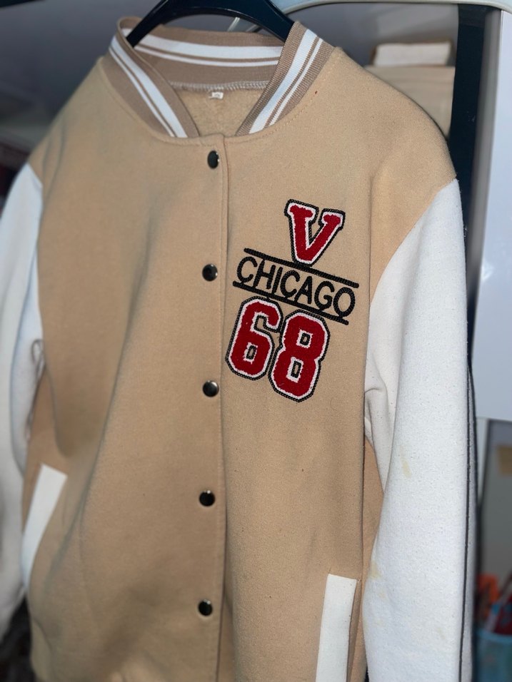 Uzun kollu, düğmeli ve V yaka kadın ceket. Bej ve beyaz tonlarda, yumuşak fleece kumaştan, '68, CHICAGO' baskılıdır.