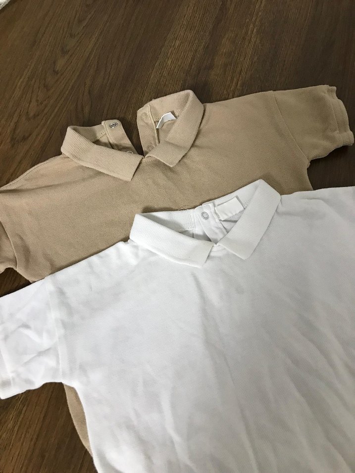 Bej ve beyaz renk, kısa kollu, yakalı ve pamuklu kumaştan bebek polo yaka zıbın. Rahat kesimiyle sade ve normcore tarzına uygun.Beyaz da hafif bi delik var kullanıma engel değil ondan fiyatı uygun tuttum.