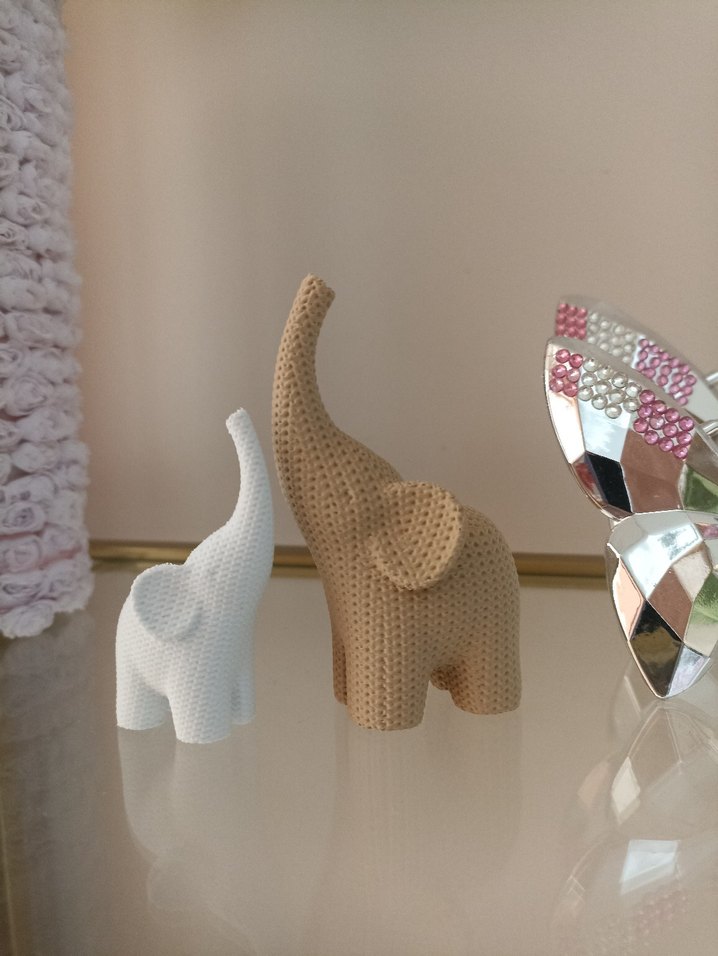 Bej ve beyaz renklerde, dokulu yüzeye sahip iki fil figürü. Her mekana hafif ve şık bir dokunuş katıyor.