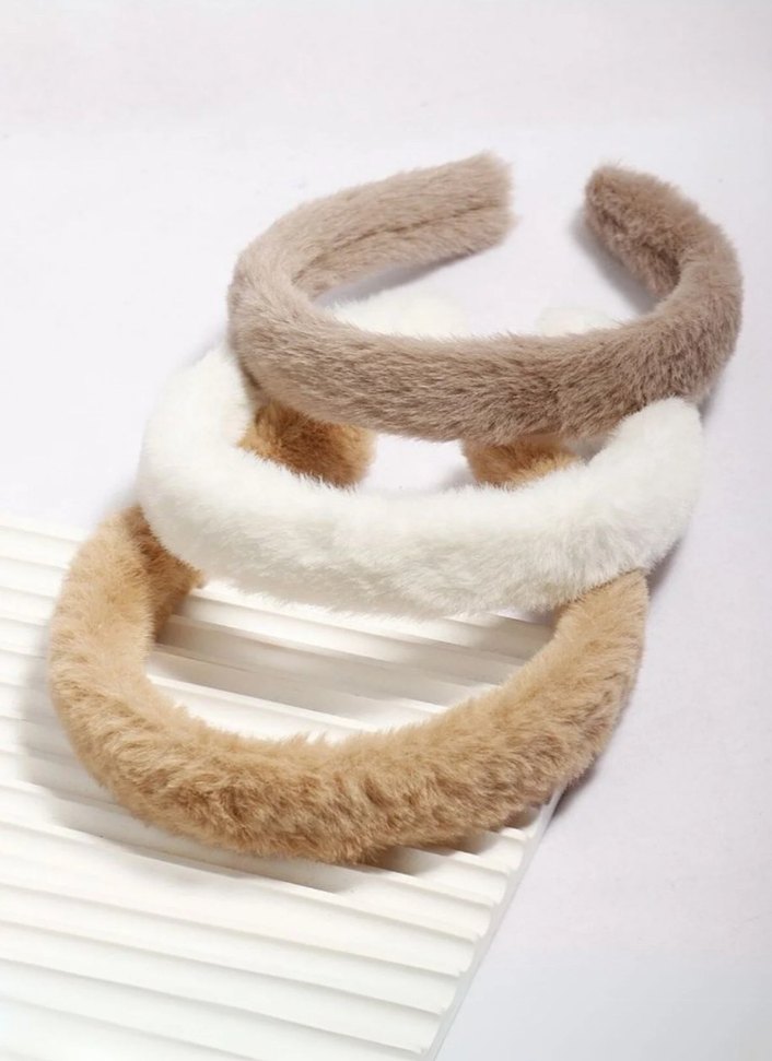 Bej, beyaz ve açık kahverengi tonlarında, yumuşak ve sıcak kürklü detaylı saç bantları, bohem tarzı için uygun.