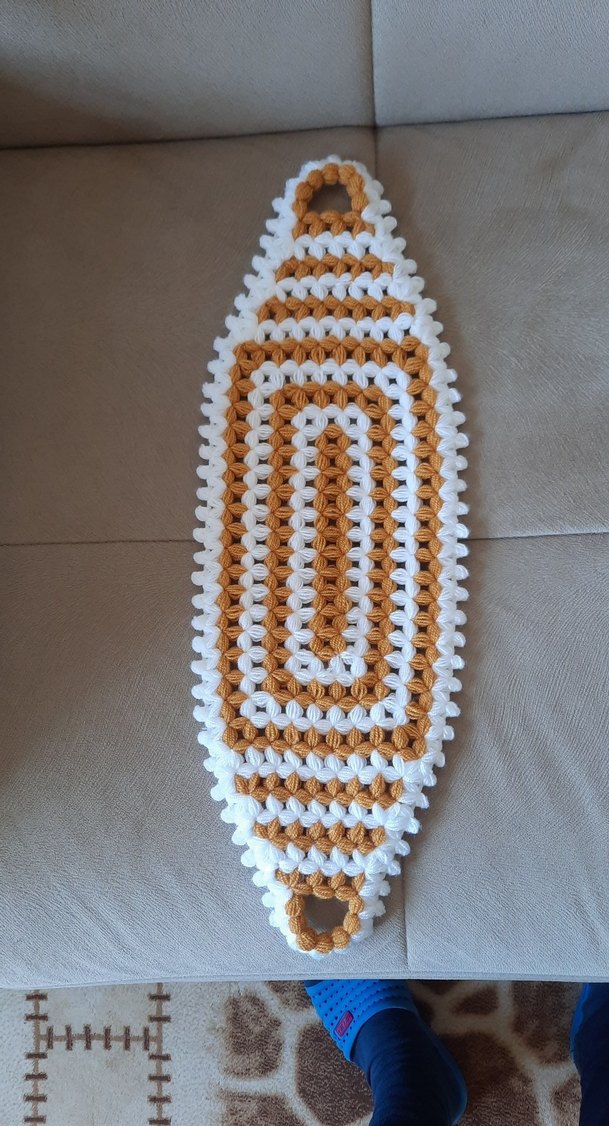 Uzun oval şekilli, bej ve beyaz renklerde örgü banyo uzun lif