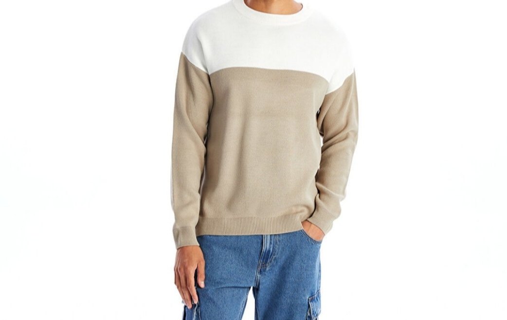 Yuvarlak yaka, bol kesim ve uzun kollu erkek triko kazak. Yumuşak sentetik kumaştan örülmüş, bej ve beyaz renk kombinasyonlu, desen içermeyen günlük kullanıma uygun kazak.