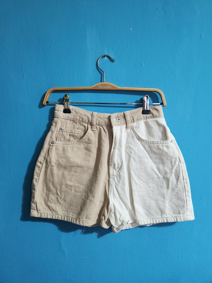 Bej renkli pastel tonlarda, salaş kesim denim mini şort, rahat ve şık sokak stili için ideal.