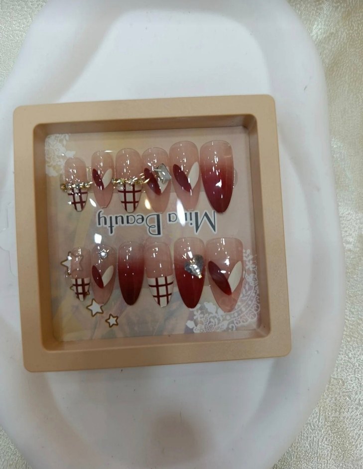 Bej ve bordo renklerde, kalp ve ızgara desenli tırnak süsü seti. Küçük yıldız detaylarıyla hafif parlak tonlarda.