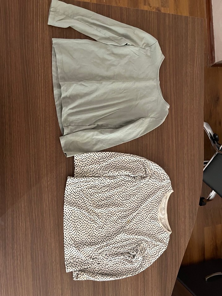Bej ve desenli iki kız uzun kollu kazak, yumuşak keten kumaştan ve rahat kesimle şık görünüyor.